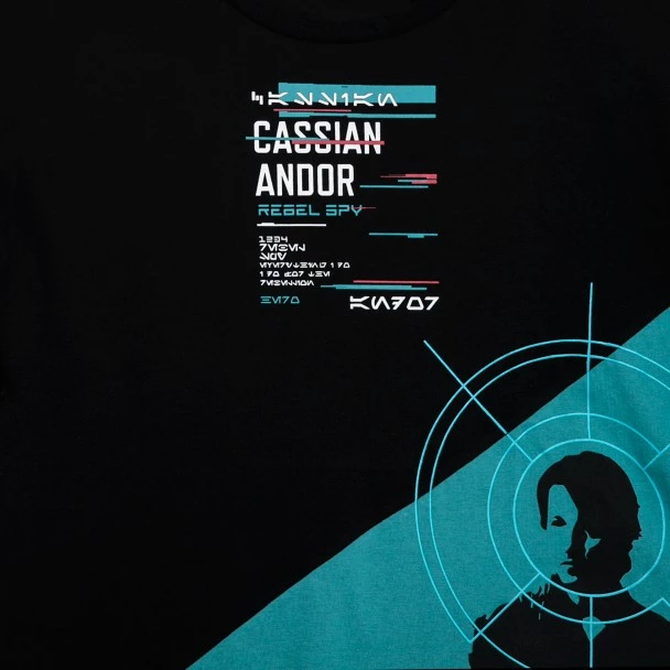 Show off your allegiance to the rebellion with this t-shirt featuring rebel spy Cassian Andor. Inspired by the Disney+ series Star Wars: Andor, this tee includes authentic Aurebesh text with artwork of Cassian and a color block design.