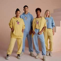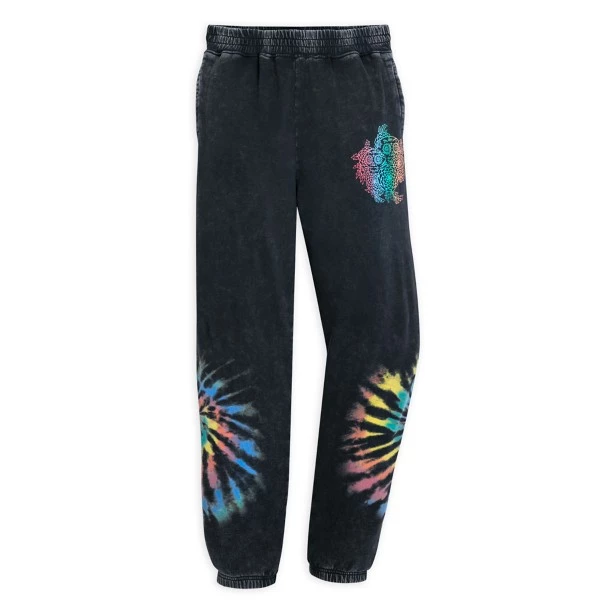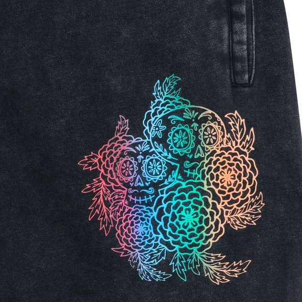 Colorful sugar skulls and flowers decorate the front hip of these jogger pants inspired by Disney and Pixar’s Coco. Bright swirls of tie-dye color decorate the shins while the sun bleach details lend a fashionably faded touch.