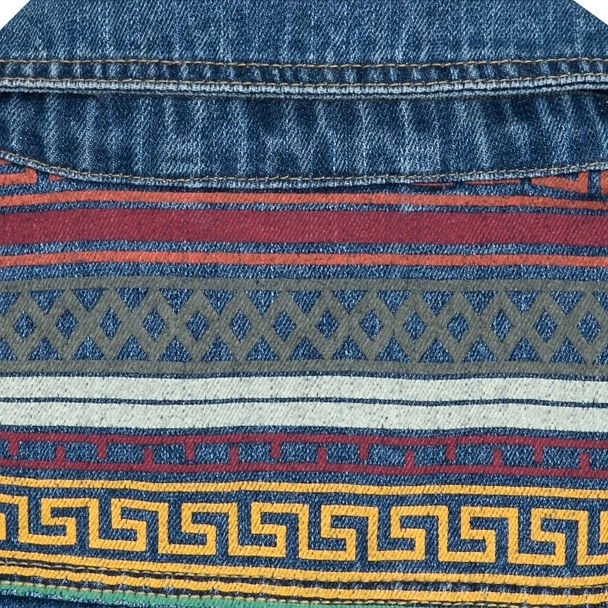 - Colorful Grecian-inspired pattern on chest pockets and back