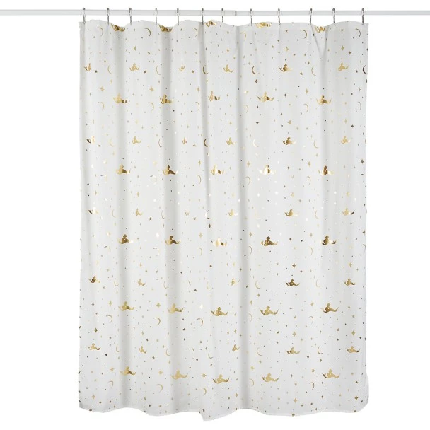 Take your bath time to a whole new world with this Jasmine shower curtain. This shimmering design features an allover gold foil print of Jasmine’s and Aladdin’s silhouettes flying through the night sky, adding a touch of magic to your bathroom.
