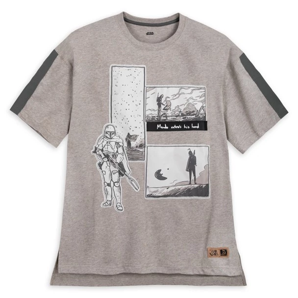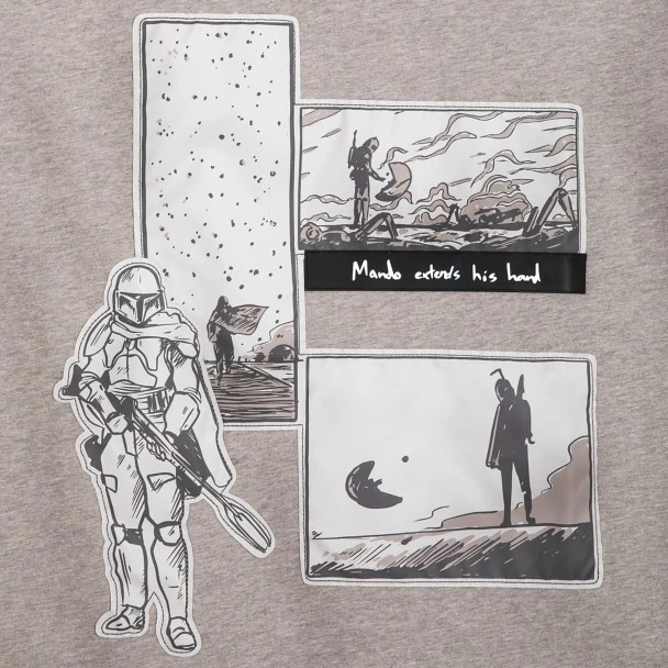 Pay homage to the series that introduced us to Din Djarin and Grogu with this cool Star Wars t-shirt. It features appliqués with artwork inspired by the Disney+ series, including the pivotal moment The Mandalorian meets baby Yoda which started their journey together.