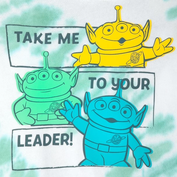 Take me to your leader in this tie-dye pullover hoodie with Pizza Planet Alien art and Toy Story Land logo.